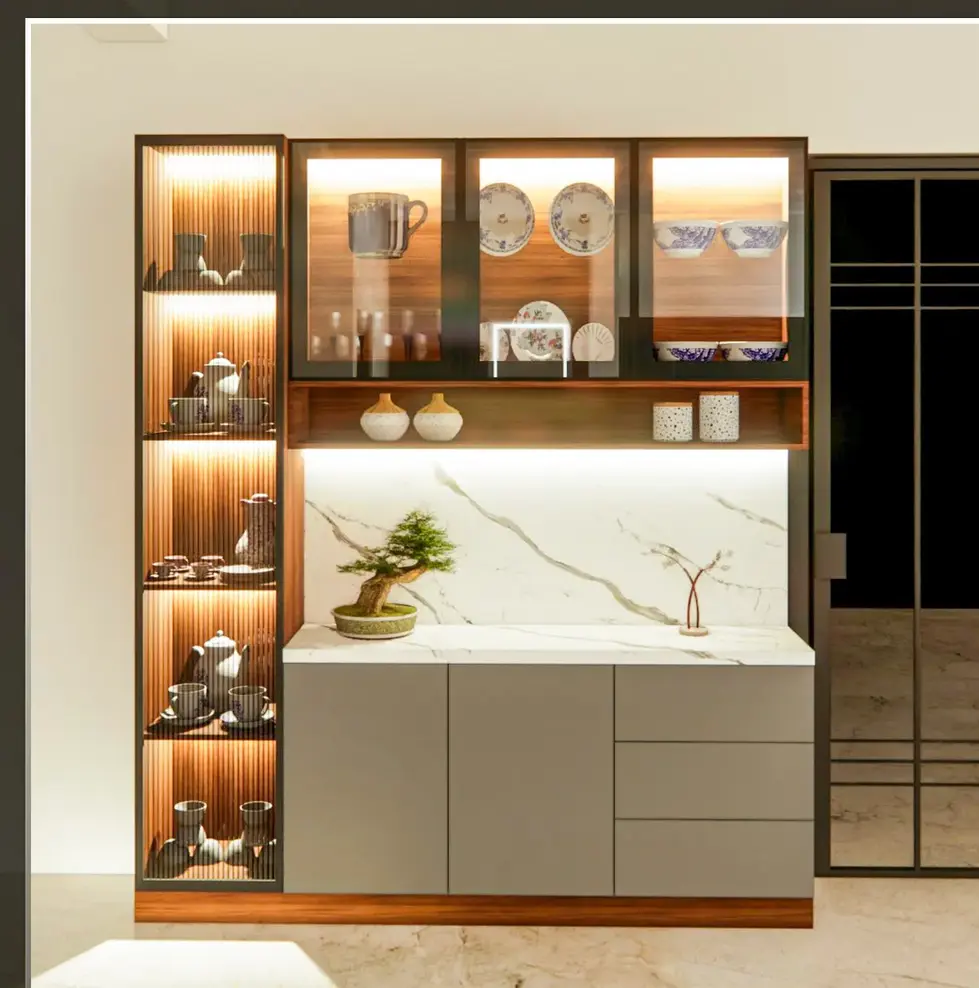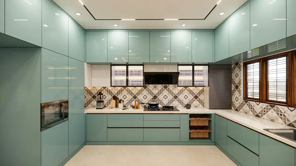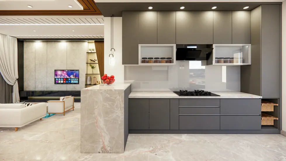 A collection of modern kitchen designs featuring sleek cabinets, marble countertops, and patterned backsplashes.